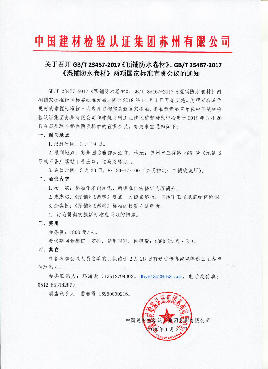 35467-2017《濕鋪防水卷材》兩項(xiàng)國(guó)家標(biāo)準(zhǔn)經(jīng)國(guó)標(biāo)委批準(zhǔn)發(fā)布,將于2018年11月1日開始實(shí)施。為幫助各單位更好的掌握標(biāo)準(zhǔn)技術(shù)內(nèi)容并貫徹實(shí)施新國(guó)家標(biāo)準(zhǔn),標(biāo)準(zhǔn)負(fù)責(zé)起草單位中國(guó)建材檢驗(yàn)認(rèn)證集團(tuán)蘇州有限公司和建筑材料工業(yè)技術(shù)監(jiān)督研究中心定于2018年3月20日在蘇州聯(lián)合舉辦兩項(xiàng)標(biāo)準(zhǔn)的宣貫會(huì)議。有關(guān)事宜通知如下:
